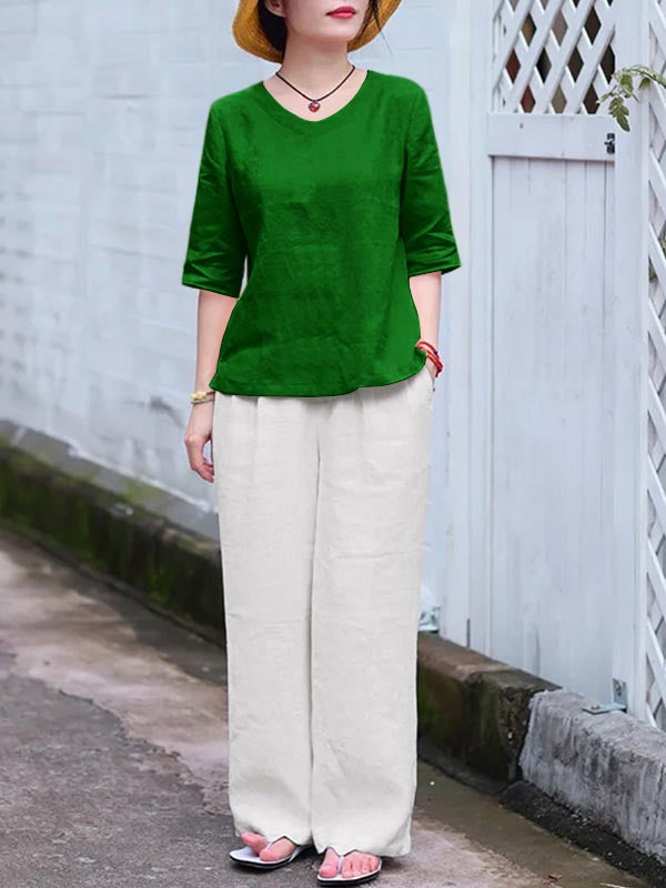 2 Menit LaluSet 2 potong celana lebar kaki katun dan linen warna solid gaya Jepang yang elegan - beli satu gratis satu