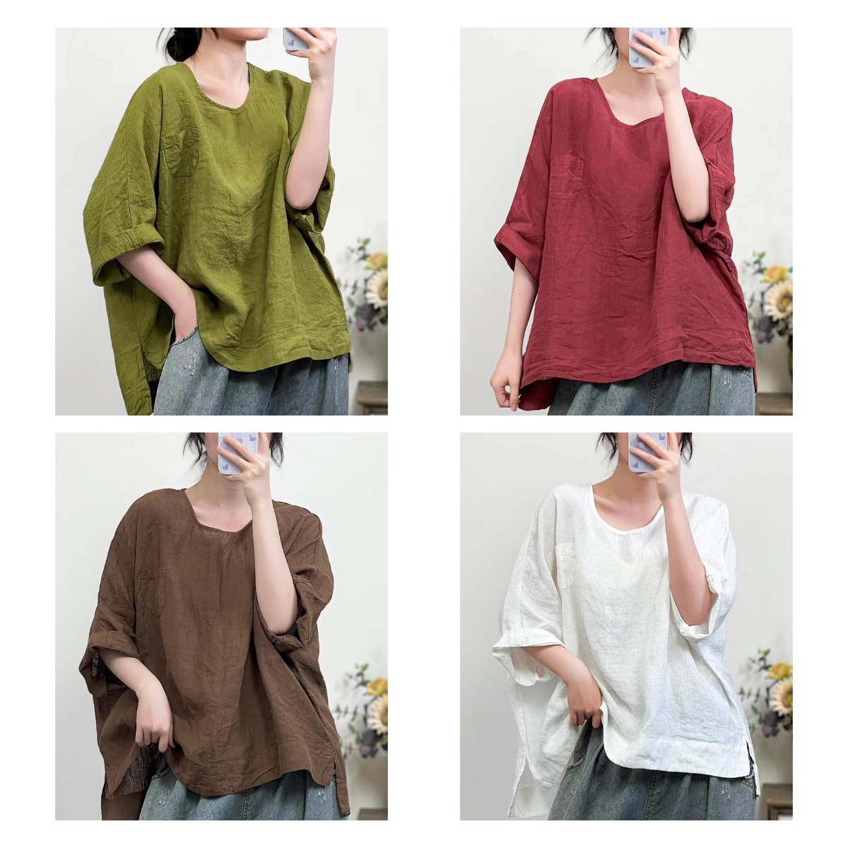 8 Menit LaluAtasan Linen Setengah Lengan Pullover Leher Bulat - beli satu gratis satu